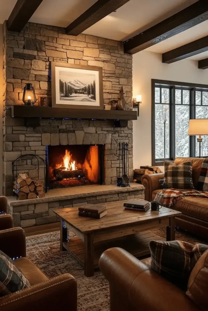 6. Incorporate warm cabin fireplace decor