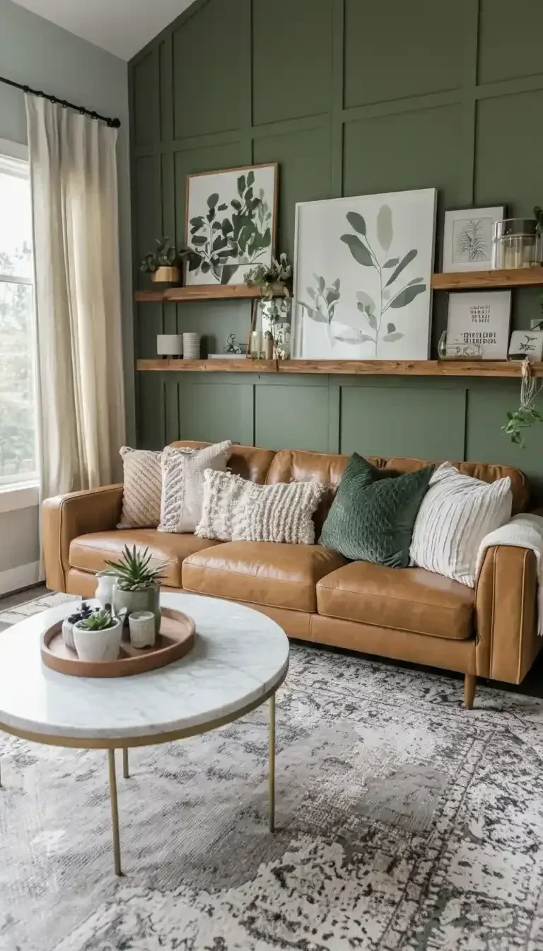 - Hang a gallery wall featuring art pieces with hints of sage green to tie the room’s color scheme together.